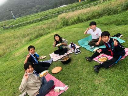 大成功でした。霧雨のような天気なので、寒い子はテントの下、涼しくて気持ちのいい子は、はらっぱで食べています。みんな元気いっぱい、たくさん食べています