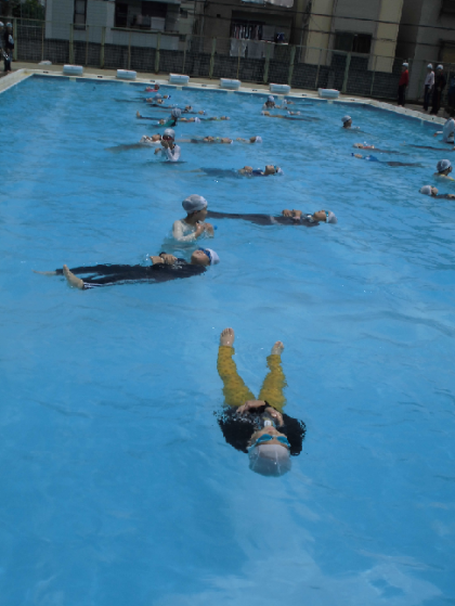 7月9日は5年生が着衣水泳を経験しました。6年生もしていましたが、おぼれかけている人にペットボトルを投げるとき、少し水を入れて投げると投げたいところに投げやすいことも教えてもらっていました。
