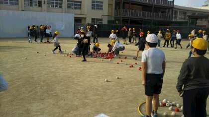 朝、8時30分から運動場で、たてわり班活動を行いました。
