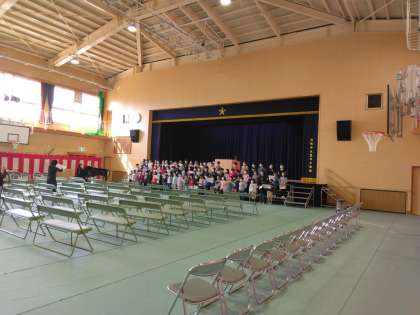 1年生が、新1年生をお迎えするため、入学式で披露する歌の練習をしています。完成した新講堂の窓から、子ども達に朝日が差し込み、春の光のもと、練習に励む1年生です。