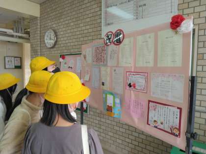 お祝いメッセージを、教育長様はじめ、保育所や幼稚園の園長様、墨江地域活動協議会会長様、以前の校長先生など、たくさんいただきました。子ども達が、足をとめて、見ています。