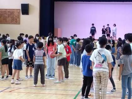今日は、1〜6年の1組の児童が講堂に集まって、班ごとにボール手渡しゲームをしました。