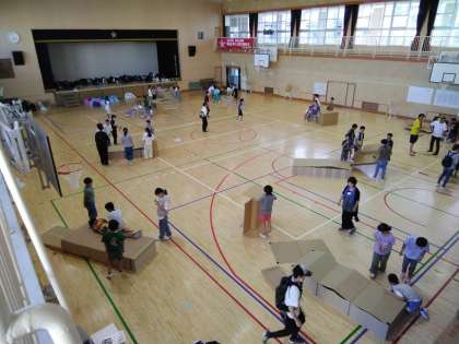 写真上、防災学習……段ボールを使って、ベッドをつくりました。 ペットボトルらんたんづくりもしました。実際に、災害に遭ったとき、自分でできることを学びました。