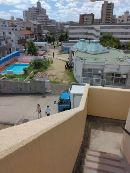写真は、上から「音楽室」「非常階段から墨江幼稚園を望む」「お迎え訓練」の様子です。