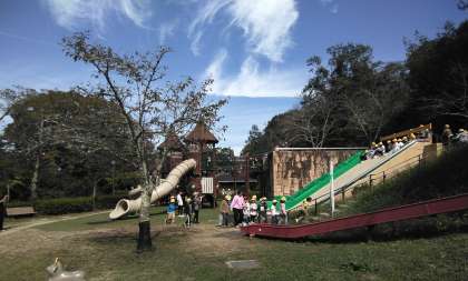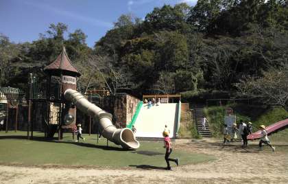 写真中:アスレチックで遊びました。中でも、大きな滑り台が人気でした。