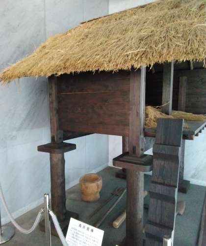 弥生文化博物館では、教科書で習った、作物を貯蔵する倉庫(写真は、復元された高床倉庫)や銅鐸、竪穴式住居などを見学しました。