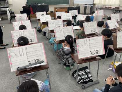 1組は音楽室でリコーダーの練習をしていました。曲は「ハッピーバースデー トゥユー」でした。初めてみんなで合わせてみたところ、けっこうそろっていて上手でした。演奏が少し難しい箇所があって、その部分練習に取り組んでいました。