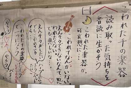 3組は国語科の学習で、「こわれた千の楽器」の音読大会をしていました。教室に取材に行った時には、残念ながらチャイムが鳴り、時間切れとなって聞けなかったのですが、自分たちのグループでどの部分をどういう風に工夫して音読するかを相談していて、それをみんなの前で発表し音読をしていました。この次は聞かせてもらおうと思います。