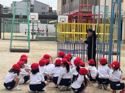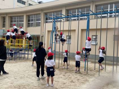 今日は1年生が学級ごとに遊具(上り棒・鉄棒・ジャングルジム)の「安全な遊び方」について学習しました。「お友達が下にいないかよく確かめて」、「危ない遊びはしません」「手でしっかり握って」など先生のお話をよく聞いた後、実際に元気よく遊んでいました。