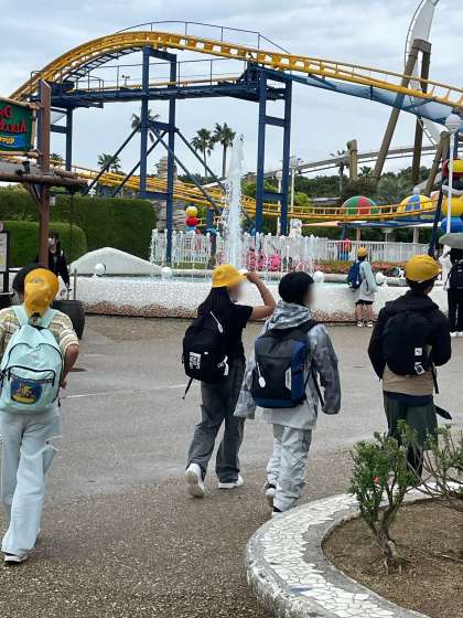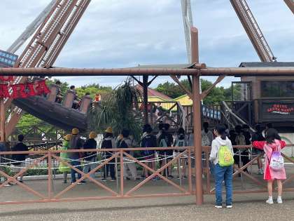 入場したときは雨が降っていましたが、入ってすぐに雨がやみ、晴れ間がのぞきはじめました。ですから最初は待望のピレネー(ジェットコースター)など止まっている乗り物があったのですが、昼前には動き始め、子どもたちはそれぞれグループで存分に楽しむことができました。