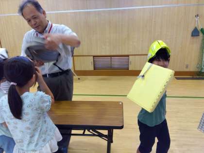 一般財団法人大阪建築防災センターから、5名の方が講師に来てくださいました。最初は、2時間目は、多目的室で映像を見ながら「災害(地震・水害)から身を守るためにはどうすればいいのか?普段からどういうことを準備しておけばいいのかを学習しました。3時間目は、たくさんの防災グッズを紹介していただき、実際に手に取って見たり、体験したりしました。そして、体験学習として「新聞紙を使っての防災スリッパ作り」「ロープワーク体験(本結び」をしました。3年生としては、かなり専門的なことも学び、とても勉強になりました。