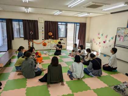 おやつタイム、ハロウィンにちなんだ絵本の読み聞かせの後、10月生まれのお子さんのお誕生日会をしました。