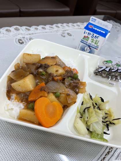 今日の給食メニューは「ハヤシライス」「キャベツのひじきドレッシング」「ミニフィッシュ」でした。「ハヤシライス」の中に♡ハートの形をしたハッピーにんじんを発見❕とても幸せな気分です。さあ誰の「ハヤシライス」に入っているのでしょうか。きっと見つけた人には幸せが訪れることでしょう。