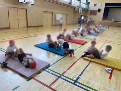 体育科の学習で体力測定をしています。2人1組になって上体起こしの測定をしています。