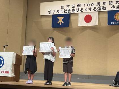 7月5日(土)、住吉区民センターで「社会を明るくする運動」小学生標語コンクールの表彰式がありました。本校からは、5年の中嶋みおりさんの標語「ごめんなさい 言える勇気を 大切に」が優秀賞に選ばれ、表彰していただきました。おめでとうございます!