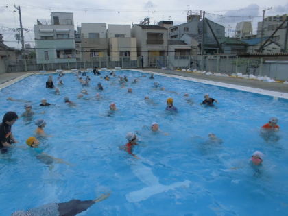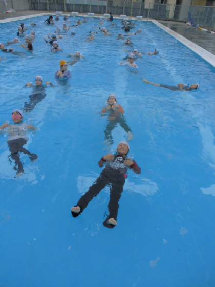 6月30日 5年生が着衣水泳をしました。4年生の時にも経験していますが、「やっぱり服着てたら進めへんなあ。」「重いなあ。」とつぶやいていました。救助を待つ人にペットボトルを投げるとき、からっぽのものより少しだけ水を入れたほうが、投げやすいし、届きやすいと思い出して行動していました。