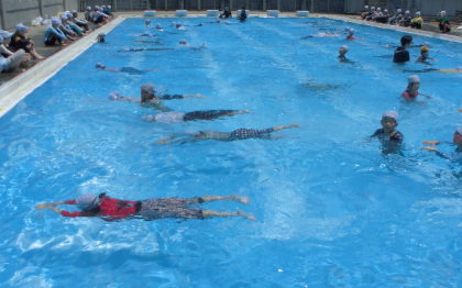 7月7日 4年生が着衣水泳をしました。初めて服を着て泳いだ子どもたち。立ち止っては「めっちゃ重いなあ。」「うわあ!進めへん!」と言いながら頑張っていました。水難にあったときは、救助が来るまで、体力を温存して長い時間浮き続けることを学びました。