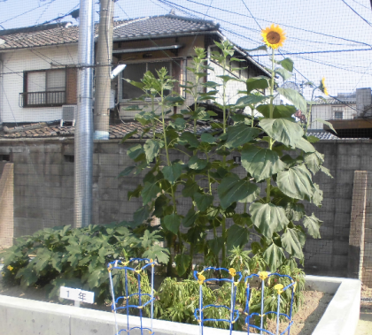 1年生が学習園で育てているひまわりの花が咲きました。これは8月1日の写真です。