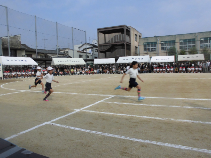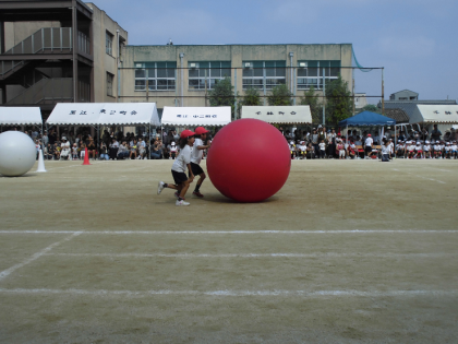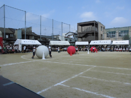 2年生は、個人走「ゴールをめざして」、団体競技「大玉ころころ」、団体演技「ウンタカ☆ウンタカ!」をしました。自分たちより大きい大玉を力をあわせて転がしました。折り返しのコーンのところも上手に回っていました。