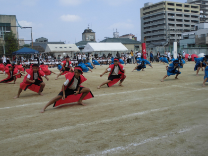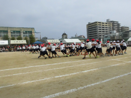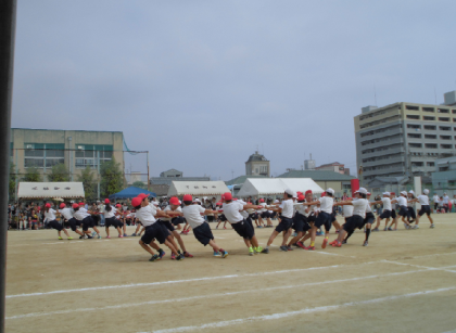5年生は、団体競技「棒引き」、団体演技「いざ舞い踊れ!墨小ソーラン」、個人走「走って!つなごう」をしました。「棒引き」は、作戦を立てみんなで力を合わせて棒に向かいました。いい勝負でした。「墨小ソーラン」の練習では、足や腰が痛くて、何度もくじけそうになりましたが、みんなで励まし合ってがんばりました。これからの墨江小学校を引っ張っていく5年生として、一生懸命踊り、すばらしい演技で大きな拍手をいただきました。