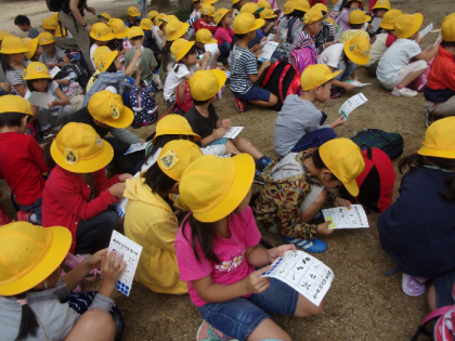 「まんまるだよ!」「きれいなの見つけたぁ〜。」と、たくさん拾いました。草花や虫さがしのビンゴも楽しみ、秋の自然に親しみました。