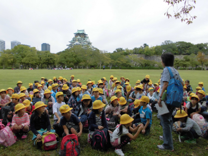 大阪城公園ではグループごとにオリエンテーリングをしました。オリエンテーリングでは大阪城に関するクイズやじゃんけんゲームをしました。各班リーダーを中心に協力して活動し、ゴールに無事到着することができました。