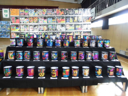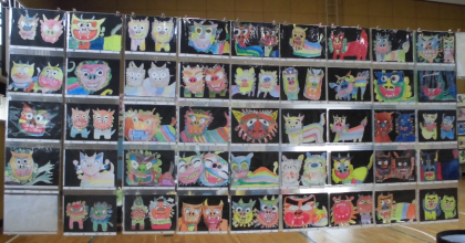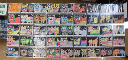 4年生の作品です。絵画は「たのシーサー」立体作品は「ステンドボックス」です。