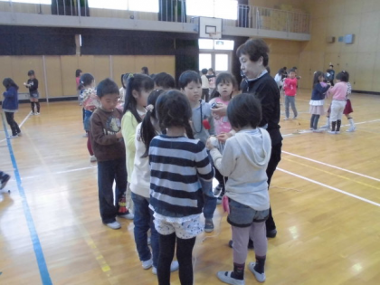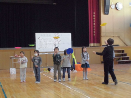 12月2日 ゲストティーチャーの森様に、こまの遊び方を教えて頂きました。ひねりごま・糸引きごま・追いかけごま・野菜ごま…などなど、いろいろな種類のこまを実際に回して見せて頂きました。外国のこまなどもあり、初めて見るこまに子どもたちは大喜びでした。その後、みんなでこま回し体験をして楽しみました。