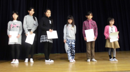 12月12日 全校児童朝会で、大阪市青少年読書感想文コンクールで学校図書館協議会賞をいただいた子どもたちを表彰しました。学校長から一人ひとり賞状を手渡してもらいました。
