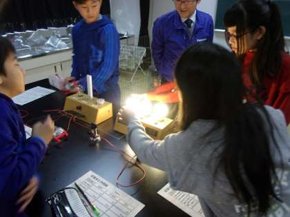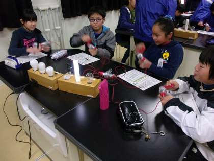 1月11日 2〜4時間目にパナソニックの方々を講師に迎え、『明かりのエコ教室』と題して、照明器具と電力の関係について教えて頂きました。手回し発電機を使って白熱灯や蛍光灯、LEDに明かりをつける実験を通して、LEDが「少ないエネルギーで最も明るい」ことを知りました。その明るさに、みんな驚いていました。分かったこととして「LEDが一番速くつき、一番明るかった」「LEDを使うと省エネになることがわかった」と書いていました。最後に講師の方から、家庭での省エネ活動への協力をお願いされましたので、一緒に取り組んでみてください。