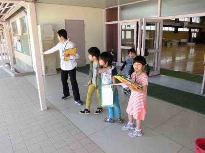 5月17日 生活科の学習で「がっこうたんけん」をしました。4月に2年生のお兄さんお姉さんに案内してもらった場所を、班に分かれて自分たちで探検しました。特別教室の中に入って絵をかいたり、シールをはって地図を完成させたりしました。友だちと協力してゴールの講堂へ向かいました。