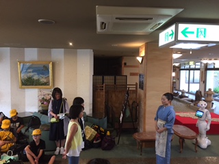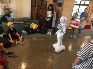 宿舎の方のお話や学校長のあいさつ、子どもたちのあいさつはもちろんですが、ペッパー君が宿泊について説明してくれました。
