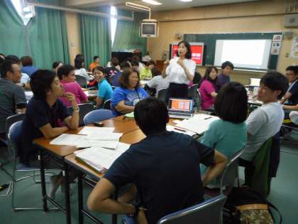 6月14日 清水丘小学校で、合同研修会をしました。これからの英語の授業に役立つように、体全体を使って研修しました。清水丘小学校の先生方との交流も深まりました。