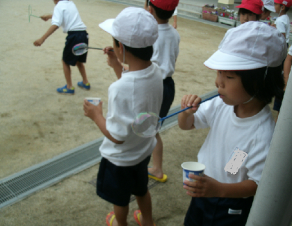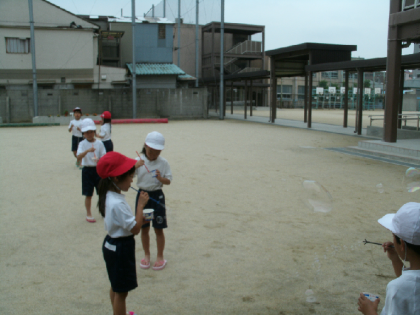 6月29日 1年生は生活科で「夏の遊び」をしました。朝からあいにくの雨模様だったので、今日はシャボン玉を作ることだけになりました。一度に多くのシャボン玉を作ったり、大きなシャボン玉を作ったりもしました。どうすればもっと大きなものが作れるのか考えて、そおっと息を抜き込んだり、ゆっくり輪っかを動かしたりしていました。