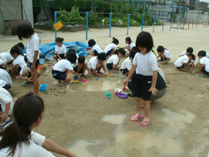 「泥んこ遊び」では、砂山や川、泥団子を作ったり、ケーキやクッキーを作ってレストランを開いたりしていました。