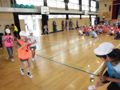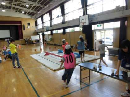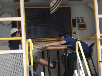朝食後は、大阪市立大学の学生のみなさんと遊びました。楽しい活動を考えてくださり、子どもたちは大盛り上がりでした。そして、学校に起震車がやってきました。震度7の揺れを体験し、その凄まじさにみんな驚いていました。大きく揺られ、しがみつくことに必死のようでした。
