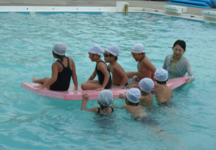浮島に乗った友だちを運ぶゲームでは、どのチームも上手に友だちを運んでいました。