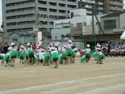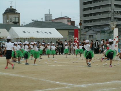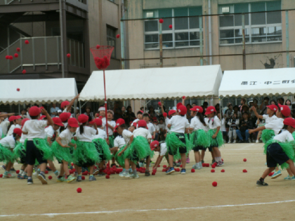 玉入れです。「♪チェッチェッコリ チェッコリ・・・♪」楽しんでいました。