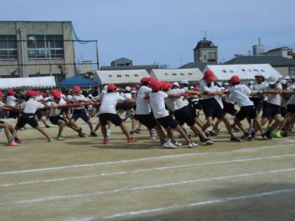 団体競技「棒引き」から始まりました。チームで協力して自分の陣地に棒を持ってきました。