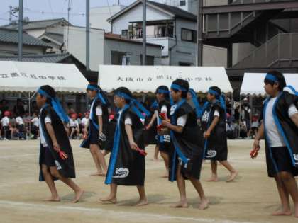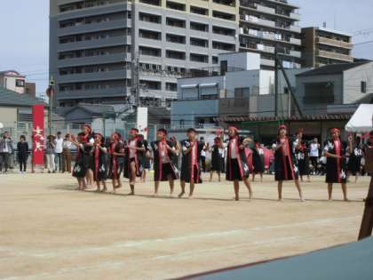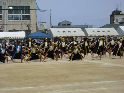自分たちで染め出したはっぴの文字「友」「和」「絆」、色に合わせた「雷」「炎」「波」の模様。力いっぱい楽しく、かわいく、かっこよく踊りました。