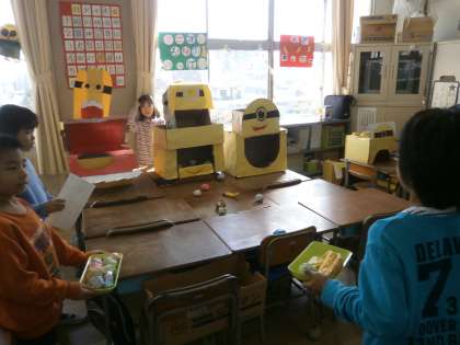 1組「ミニオンシティ」。ひときわ目を引く大きなミニオンは力作でした!ミニオンが動くのでお客さんも集中してねらっていました。