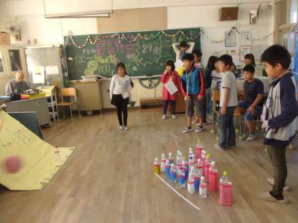 1組「新VS嵐ボーリング」。段ボールで作った斜面を転がしてピンを倒すというボーリング。高学年らしい凝った工夫が見られました。