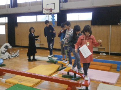 1組「アスレチック」。跳び箱や平均台を使って作られたアスレチック。低学年の子ども達も高い跳び箱から上手に着地していました。大きな魚も印象的でした!
