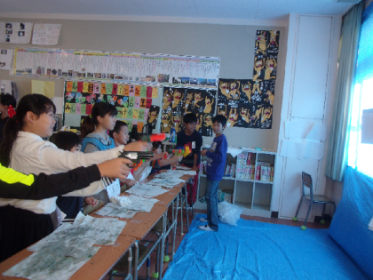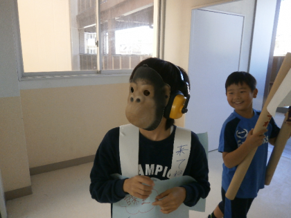 3組「チンパンジーの名は。」。タブレットを使った映像でゲームの説明をしていたことが、さすが6年生!宣伝に回るチンパンジーに手を振る子もいました。