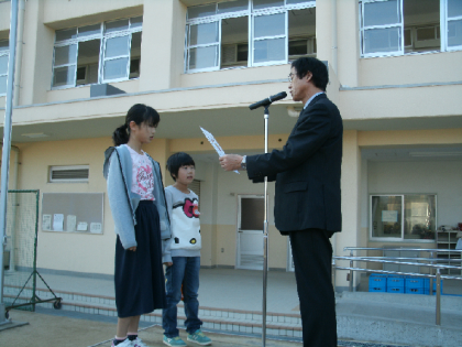 11月27日 女子ミニバスチームが大会で優勝したので、全校朝会で表彰しました。