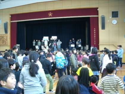 2月7日 給食委員会の児童が全校児童集会で発表しました。学校給食週間の時に発表する予定でしたが、インフルエンザ等の流行で今日になりました。問題の答えを「立つ」「座る」で表し、本校の給食について多くの気づきを得ました。