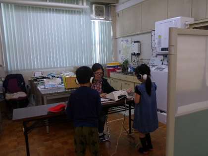 4月20日 聴力検査2日目。今日は2年生の聴力検査です。オージオメーターを使って検査をします。とても上手にできました。