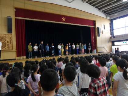 4月23日 前期代表委員の子どもたちが全校児童朝会で自己紹介をしました。運動会まで墨江小学校の児童会の中心で活動します。