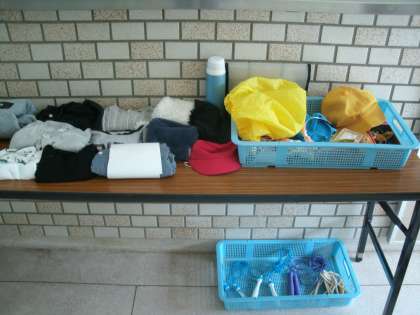 4月からの約1ヶ月半の間に届いた落とし物を玄関掲示板の下に並べています。本日のアクションプラン説明会並びに学習参観・懇談会にお越しの際に、お子さんの物がないかご確認ください。また、土日に講堂を利用したときにも忘れ物が増えていますのでご注意ください。