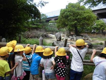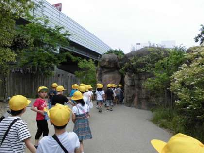 阪堺電車の貸切電車で、天王寺動物園に小学校に入って初めての遠足に行きました。朝から天気も良く、木に登っていくコアラや水にもぐったり浮かんだりしているカバなど、動物たちも元気に活動していました。みんなは「大きいなあ。」「うごいてるよ。」と歓声をあげながら、しっかりと動物をみることができました。さすが1年生。行きも帰りも友だちと手をつなぎ、きちんと並んであるくことができました。